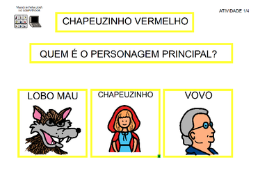 | Nº Visualizações: 1688 Nº Pranchas Relacionadas: 4 Tipo: SDP Prancha Dinâmica: SIM Descrição: Atividade para ser usada no computador ou impressa. Contém perguntas sobre a história da Chapeuzinho Vermelho, que deve ser previamente contada. Pode ser utilizada com varredura ou acesso direto. Nível: iniciante Autor: Renata Torres de Souza Profissão: Professora de Sala de Recursos Multifuncional E-mail: torressrenata@gmail.com | |||||||||