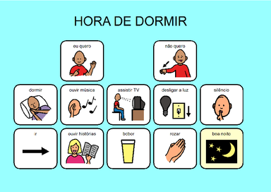 | Nº Visualizações: 1375 Nº Pranchas Relacionadas: 1 Tipo: BoardMaker Prancha Dinâmica: NÃO Descrição: Atividade para ser impressa que possui símbolos do que o usuário pode querer fazer na hora de dormir. Nível: iniciante Autor: Larissa da Rocha Guimarães Profissão: Aluna de Graduação de Terapia Ocupacional da UFRJ E-mail: l.rocha08@gmail.com | |||||||||
