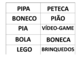 | Nº Visualizações: 2003 Nº Pranchas Relacionadas: 2 Tipo: PowerPoint Prancha Dinâmica: NÃO Descrição: Atividade desenvolvida com o software PowerPoint para ser impressa. Conjunto de figuras relacionadas aos brinquedos e suas palavras. Pode ser usado para pareamento, como jogo de bingo ou memória no trabalho de alfabetização. Nível: iniciante Autor: Janaina Larrate Profissão: Professora da Oficina Vivencial / E-IHA E-mail: ofvivencialiha@rio.rj.gov.br | |||||||||