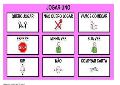 | Nº Visualizações: 516 Nº Pranchas Relacionadas: 3 Tipo: Prancha Fácil Prancha Dinâmica: NÃO Descrição: Prancha de comunicação do projeto TO BRINCANDO - UFRJ. Nível: iniciante Autor: Giovana Monteiro dos Santos Profissão: Graduação em Terapia Ocupacional E-mail: giovanamsUFRJ@gmail.com | |||||||||