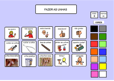 | Nº Visualizações: 1148 Nº Pranchas Relacionadas: 1 Tipo: BoardMaker Prancha Dinâmica: NÃO Descrição: Prancha para ser impressa. Poder ser utilizada no salão de beleza para fazer as unhas. Nível: iniciante Autor: Priscila Rodrigues Profissão: Estudante de Terapia Ocupacional da UFRJ E-mail: priscila.rodriguesto@gmail.com | |||||||||