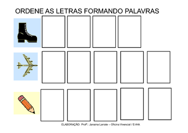 | Nº Visualizações: 1334 Nº Pranchas Relacionadas: 6 Tipo: PowerPoint Prancha Dinâmica: NÃO Descrição: Atividade para usar no computador ou para ser impressa com a qual o usuário monta palavras. Nível: iniciante Autor: Janaina Larrate Profissão: Professora da Oficina Vivencial / E-IHA E-mail: ofvivencialiha@rio.rj.gov.br | |||||||||