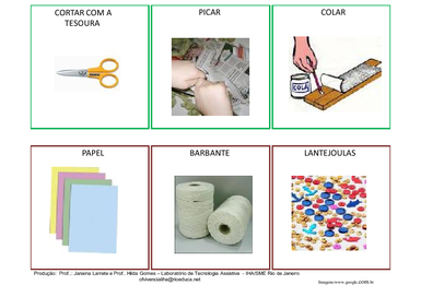 | Nº Visualizações: 998 Nº Pranchas Relacionadas: 1 Tipo: PowerPoint Prancha Dinâmica: NÃO Descrição: Prancha para ser impressa. Possui símbolos relacionados a uma atividade de recorte e colagem. Nível: iniciante Autor: Janaina Larrate Profissão: Professora da Oficina Vivencial / E-IHA E-mail: ofvivencialiha@rio.rj.gov.br | |||||||||