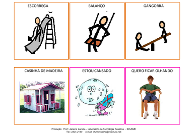| Nº Visualizações: 1035 Nº Pranchas Relacionadas: 1 Tipo: PowerPoint Prancha Dinâmica: NÃO Descrição: Prancha para ser impressa. Possui símbolos relacionados a um parquinho. Nível: iniciante Autor: Janaina Larrate Profissão: Professora da Oficina Vivencial / E-IHA E-mail: ofvivencialiha@rio.rj.gov.br | |||||||||