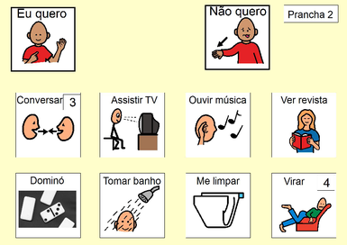 | Nº Visualizações: 2038 Nº Pranchas Relacionadas: 1 Tipo: BoardMaker Prancha Dinâmica: NÃO Descrição: Através desta prancha o usuário pode expressar sua vontade em relação a: conversar,assistir TV, ouvir música, ver revista, dominó, tomar banho, me limpar e virar. Nível: iniciante Autor: Juliana Mannini Profissão: Residente 1º ano de Terapia Ocupacional E-mail: jumannini@yahoo.com.br | |||||||||