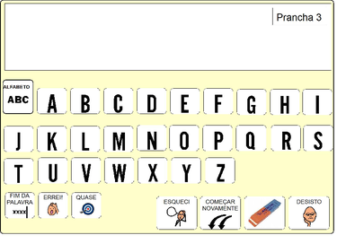 | Nº Visualizações: 1809 Nº Pranchas Relacionadas: 1 Tipo: BoardMaker Prancha Dinâmica: NÃO Descrição: Através desta prancha, o usuário poderá formar palavras com as letras do alfabeto. Nível: iniciante Autor: Juliana Mannini Profissão: Residente 1º ano de Terapia Ocupacional E-mail: jumannini@yahoo.com.br | |||||||||