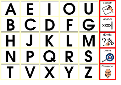 | Nº Visualizações: 1776 Nº Pranchas Relacionadas: 1 Tipo: BoardMaker Prancha Dinâmica: NÃO Descrição: Nesta prancha encontram-se todas as letras do alfabeto em tamanho grande e opções como "apagar", "terminei", "dúvida", "quase" e "cansado". Nível: iniciante Autor: Miryam Pelosi Profissão: Terapeuta Ocupacional E-mail: miryam.pelosi@gmail.com | |||||||||
