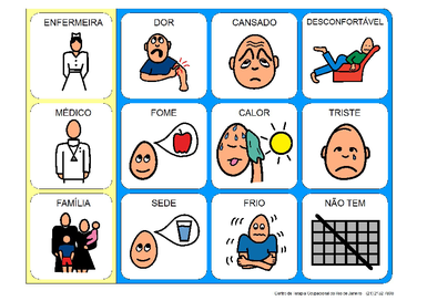 | Nº Visualizações: 1428 Nº Pranchas Relacionadas: 1 Tipo: BoardMaker Prancha Dinâmica: NÃO Descrição: Nesta prancha encontram-se símbolos os quais auxiliam na comunicação, podendo o usuário se comunicar com símbolos como: enfermeira, médico, família, dor, cansado, desconfortável, fome, calor, triste, sede, frio e não tem o símbolo. Nível: iniciante Autor: Miryam Pelosi Profissão: Terapeuta Ocupacional E-mail: miryam.pelosi@gmail.com | |||||||||