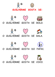| Nº Visualizações: 1415 Nº Pranchas Relacionadas: 2 Tipo: Comunicar com Símbolos Prancha Dinâmica: NÃO Descrição: Fala sobre várias coisas que o menino Guilherme gosta. desenvolvida com o software Comunicar com símbolos. Texto inicial de leitura onde a maior parte das palavras se repete. Nível: iniciante Autor: Miryam Bonadiu Pelosi Profissão: Terapeuta Ocupacional E-mail: miryam.pelosi@gmail.com | |||||||||