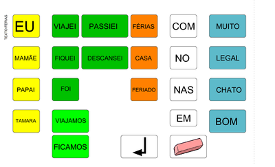 | Nº Visualizações: 1240 Nº Pranchas Relacionadas: 1 Tipo: Overlaymaker Prancha Dinâmica: SIM Descrição: Atividade que permite ao usuário montar frases sobre o que foi feito nas férias ou feriado e o que ele achou: chato, legal ou bom. Nível: iniciante Autor: Naila Porto Machado de Oliveira Profissão: Fonoaudióloga E-mail: naila.bela@hotmail.com | |||||||||