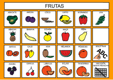 | Nº Visualizações: 1464 Nº Pranchas Relacionadas: 1 Tipo: BoardMaker Prancha Dinâmica: NÃO Descrição: Nesta prancha encontram-se diversos símbolos referentes às frutas. Dentre elas: abacate, ameixa, abacate, melancia, banana, goiaba, maçã,laranja entre outras. Nível: iniciante Autor: Márcia Ribeiro de Lima Profissão: Estudante de Terapia Ocupacional - UFRJ E-mail: marcia.rdlima@gmail.com | |||||||||