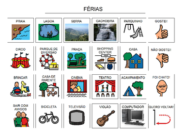 | Nº Visualizações: 2122 Nº Pranchas Relacionadas: 1 Tipo: BoardMaker Prancha Dinâmica: NÃO Descrição: Prancha para ser impressa com a qual o usuário pode relatar o que fez nas férias. Nível: iniciante Autor: Camilla Costa Profissão: Aluna de Graduação de Terapia Ocupacional da UFRJ E-mail: camillafcosta@gmail.com | |||||||||