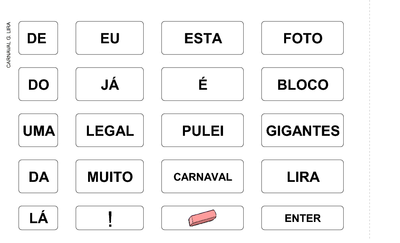 | Nº Visualizações: 1034 Nº Pranchas Relacionadas: 2 Tipo: Overlaymaker Prancha Dinâmica: SIM Descrição: Atividade para o usuário montar frases ou textos sobre o carnaval. Nível: iniciante Autor: Naila Porto Machado de Oliveira Profissão: Fonoaudióloga E-mail: naila.bela@hotmail.com | |||||||||