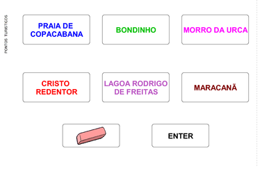 | Nº Visualizações: 1005 Nº Pranchas Relacionadas: 1 Tipo: Overlaymaker Prancha Dinâmica: SIM Descrição: Atividade que apresenta 6 diferentes pontos turísticos do Rio de Janeiro. Nível: iniciante Autor: Naila Porto Machado de Oliveira Profissão: Fonoaudióloga E-mail: naila.bela@hotmail.com | |||||||||