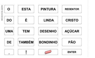 | Nº Visualizações: 1415 Nº Pranchas Relacionadas: 1 Tipo: Overlaymaker Prancha Dinâmica: SIM Descrição: Atividade possui várias palavras para formar frases sobre uma pintura da cidade do Rio de Janeiro. Nível: iniciante Autor: Naila Porto Machado de Oliveira Profissão: Fonoaudióloga E-mail: naila.bela@hotmail.com | |||||||||
