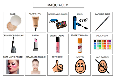 | Nº Visualizações: 1715 Nº Pranchas Relacionadas: 1 Tipo: BoardMaker Prancha Dinâmica: NÃO Descrição: Prancha para ser impressa com os recursos utilizados para fazer maquiagem. Nível: iniciante Autor: Camilla Costa Profissão: Aluna de Graduação de Terapia Ocupacional da UFRJ E-mail: camillafcosta@gmail.com | |||||||||