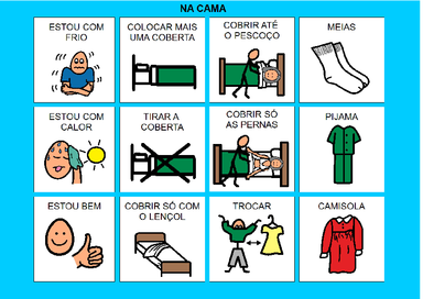 | Nº Visualizações: 1285 Nº Pranchas Relacionadas: 1 Tipo: BoardMaker Prancha Dinâmica: NÃO Descrição: Prancha para ser impressa. Possui símbolos que permitem ao usuário dizer se está com frio ou com calor e como quer se cobrir. Nível: iniciante Autor: Layla Sanches Profissão: Aluna de Graduação de Terapia Ocupacional da UFRJ E-mail: laylarsanches@gmail.com | |||||||||