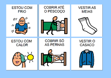 | Nº Visualizações: 1215 Nº Pranchas Relacionadas: 1 Tipo: BoardMaker Prancha Dinâmica: NÃO Descrição: Prancha para ser impressa. Possui símbolos que permitem ao usuário dizer se está com frio ou com calor e como quer se cobrir. Nível: iniciante Autor: Layla Sanches Profissão: Aluna de Graduação de Terapia Ocupacional da UFRJ E-mail: laylarsanches@gmail.com | |||||||||