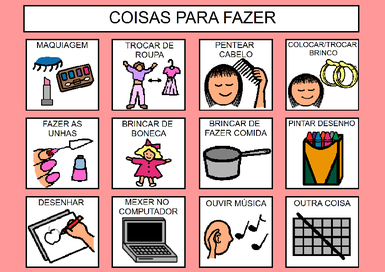 | Nº Visualizações: 1329 Nº Pranchas Relacionadas: 1 Tipo: BoardMaker Prancha Dinâmica: NÃO Descrição: Nesta prancha encontram-se símbolos referentes às atividades que as meninas gostam de realizar, tais como: maquiagem, trocar de roupa, pentear cabelo, colocar/trocar brincos, fazer unhas, brincar de boneca, brincar de fazer comida, pintar, desenhar, usar o computador, ouvir música e “outra coisa”. Nível: iniciante Autor: Márcia Ribeiro de Lima Profissão: Estudante de Terapia Ocupacional - UFRJ E-mail: marcia.rdlima@gmail.com | |||||||||