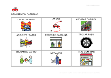 | Nº Visualizações: 1022 Nº Pranchas Relacionadas: 1 Tipo: Word Prancha Dinâmica: NÃO Descrição: Prancha de comunicação construída com os símbolos ARASAAC sobre brincar com carrinho, com 9 opções. Prancha para imprimir. Nível: iniciante Autor: Daniel dos Santos Profissão: Aluno de Graduação de Terapia Ocupacional da UFRJ E-mail: dankriok@gmail.com | |||||||||