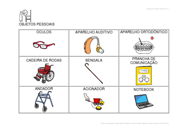 | Nº Visualizações: 1148 Nº Pranchas Relacionadas: 1 Tipo: Word Prancha Dinâmica: NÃO Descrição: Prancha de comunicação construida com símbolos ARASAAC sobre objetos pessoais, com 9 opções. Prancha para imprimir. Nível: iniciante Autor: Daniel dos Santos Profissão: Aluno de Graduação de Terapia Ocupacional da UFRJ E-mail: dankriok@gmail.com | |||||||||