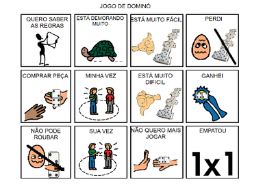 | Nº Visualizações: 1077 Nº Pranchas Relacionadas: 1 Tipo: BoardMaker Prancha Dinâmica: NÃO Descrição: Atividade com opções para que o usuário possa interagir enquanto joga dominó. Nível: iniciante Autor: Miryam Bonadiu Pelosi Profissão: Terapeuta Ocupacional E-mail: miryam.pelosi@gmail.com | |||||||||