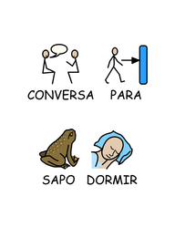 | Nº Visualizações: 1164 Nº Pranchas Relacionadas: 4 Tipo: Comunicar com Símbolos Prancha Dinâmica: NÃO Descrição: Conversa Para Sapo Dormir é uma história infantil cuja a moral dela é: "Não queira parecer ser aquilo que não é". Nível: iniciante Autor: Márcia Ribeiro de Lima Profissão: Estudante de Terapia Ocupacional - UFRJ E-mail: marcia.rdlima@gmail.com | |||||||||