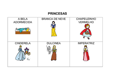 | Nº Visualizações: 1061 Nº Pranchas Relacionadas: 1 Tipo: Word Prancha Dinâmica: NÃO Descrição: Prancha com símbolos do ARASSAC de algumas princesas das histórias infantis. Nível: iniciante Autor: Larissa Fernandes Profissão: Estudante de Terapia Ocupacional UFRJ E-mail: lara_tfernandes@hotmail.com | |||||||||