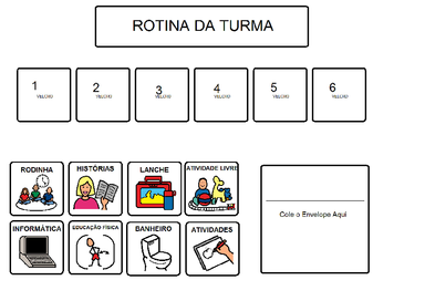 | Nº Visualizações: 1766 Nº Pranchas Relacionadas: 1 Tipo: BoardMaker Prancha Dinâmica: NÃO Descrição: Prancha para ser impressa com a qual o usuário pode construir a rotina da turma. Nível: iniciante Autor: Iony Oliveira Soares Profissão: Professora de Sala de Recursos Multifuncional E-mail: ionyoliveiri@gmail.com | |||||||||