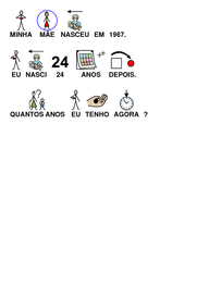 | Nº Visualizações: 1168 Nº Pranchas Relacionadas: 1 Tipo: Comunicar com Símbolos Prancha Dinâmica: NÃO Descrição: Atividade desenvolvida no software Comunicar com Símbolos que possui um problema matemático relacionado a idade. Nível: iniciante Autor: Larissa da Rocha Guimarães Profissão: Aluna de Graduação de Terapia Ocupacional da UFRJ E-mail: l.rocha08@gmail.com | |||||||||