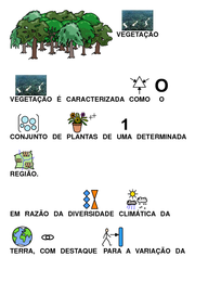 | Nº Visualizações: 1194 Nº Pranchas Relacionadas: 2 Tipo: Comunicar com Símbolos Prancha Dinâmica: NÃO Descrição: Atividade desenvolvida no software Comunicar com Símbolos que fala sobre o que é uma vegetação e quais são os tipos que existem. Nível: iniciante Autor: Larissa da Rocha Guimarães Profissão: Aluna de Graduação de Terapia Ocupacional da UFRJ E-mail: l.rocha08@gmail.com | |||||||||