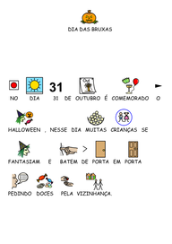 | Nº Visualizações: 1344 Nº Pranchas Relacionadas: 1 Tipo: Comunicar com Símbolos Prancha Dinâmica: NÃO Descrição: Resumo sobre o dia das bruxas que é comemorado no dia 31 de outubro. Nível: iniciante Autor: Larissa Fernandes Profissão: Estudante de Terapia Ocupacional UFRJ E-mail: lara_tfernandes@hotmail.com | |||||||||