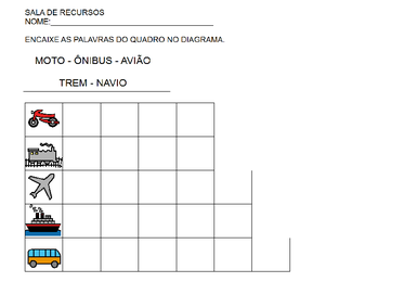 | Nº Visualizações: 1177 Nº Pranchas Relacionadas: 1 Tipo: BoardMaker Prancha Dinâmica: NÃO Descrição: Atividade para ser impressa. Completar os nomes dos meios de transporte. Nível: iniciante Autor: Eloisa dos Santos Rosa Profissão: Professora E-mail: elorosa22@hotmail.com | |||||||||