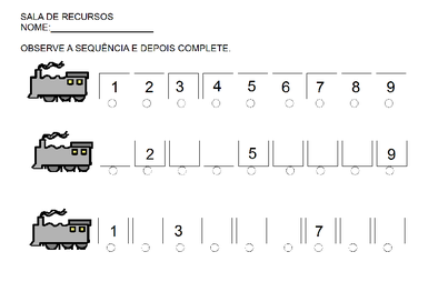 | Nº Visualizações: 1716 Nº Pranchas Relacionadas: 1 Tipo: BoardMaker Prancha Dinâmica: NÃO Descrição: Atividade para imprimir.Completar a sequência numérica. Nível: iniciante Autor: Eloisa dos Santos Rosa Profissão: Professora E-mail: elorosa22@hotmail.com | |||||||||
