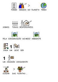 | Nº Visualizações: 1240 Nº Pranchas Relacionadas: 2 Tipo: Comunicar com Símbolos Prancha Dinâmica: NÃO Descrição: Poema que alerta sobre o cuidado com nosso Planeta. Nível: iniciante Autor: Larissa Fernandes Profissão: Estudante de Terapia Ocupacional UFRJ E-mail: lara_tfernandes@hotmail.com | |||||||||