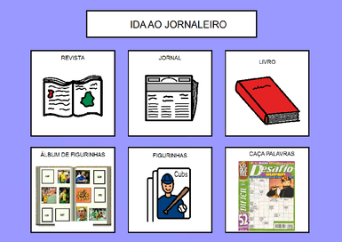 | Nº Visualizações: 940 Nº Pranchas Relacionadas: 1 Tipo: BoardMaker Prancha Dinâmica: NÃO Descrição: Prancha de comunicação para ser impressa. Pode ser utilizada quando a pessoa vai ao jornaleiro para comprar alguma coisa. Nível: iniciante Autor: Priscila Rodrigues Profissão: Estudante de Terapia Ocupacional da UFRJ E-mail: priscila.rodriguesto@gmail.com | |||||||||