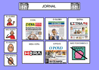 | Nº Visualizações: 1320 Nº Pranchas Relacionadas: 1 Tipo: BoardMaker Prancha Dinâmica: NÃO Descrição: Prancha de comunicação para ser impressa. Esta prancha é sobre alguns jornais do Rio de Janeiro. Nível: iniciante Autor: Priscila Rodrigues Profissão: Estudante de Terapia Ocupacional da UFRJ E-mail: priscila.rodriguesto@gmail.com | |||||||||
