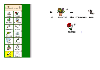 | Nº Visualizações: 1146 Nº Pranchas Relacionadas: 1 Tipo: Comunicar com Símbolos Prancha Dinâmica: SIM Descrição: Atividade para ser usada no computador onde o usuário diz quais são as partes que compõem uma planta. Nível: iniciante Autor: Layla Sanches Profissão: Aluna de Graduação de Terapia Ocupacional da UFRJ E-mail: laylarsanches@gmail.com | |||||||||