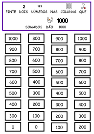 | Nº Visualizações: 1055 Nº Pranchas Relacionadas: 3 Tipo: Invento Prancha Dinâmica: NÃO Descrição: Atividade desenvolvida para ser impressa cuja proposta é somar os números das colunas para obter diferentes resultados. Nível: iniciante Autor: Thays Rodrigues Pires Profissão: Aluna de Graduação de Terapia Ocupacional da UFRJ E-mail: thaysrpires@gmail.com | |||||||||