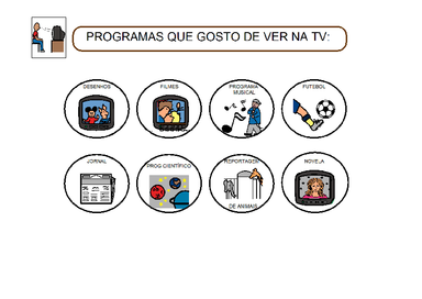| Nº Visualizações: 1241 Nº Pranchas Relacionadas: 1 Tipo: BoardMaker Prancha Dinâmica: NÃO Descrição: Prancha para ser impressa com 8 opções onde o usuário indica o que gosta de assistir na televisão. Nível: iniciante Autor: Lindinete Telles Menezes Profissão: Professora de Sala de Recursos Multifuncional E-mail: lindimenezes@hotmail.com | |||||||||
