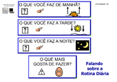 Banho de boneca e Escovar os dentes Atividade descreve como a menina deu banho e escovou os dentes da boneca. ... Miryam Bonadiu Pelosi 1.329 acessos 11/06/2011 |  Frutas OK Nesta prancha encontram-se diversos símbolos referentes às frutas. Dentre elas: abacate, ameixa, ... Márcia Ribeiro de Lima 1.442 acessos 08/09/2016 |  Roupas e Acessórios OK Prancha de comunicação sobre vestuário e acessórios. ... Márcia Ribeiro de Lima 1.241 acessos 08/09/2016 |  Cuidados pessoais Prancha com opções de cuidados pessoais. ... Larissa Fernandes 1.577 acessos 18/06/2011 |