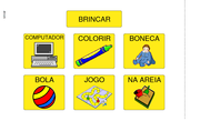 Símbolo Solto - Brincar Símbolo solto para ser impresso relacionado a palavra "brincar". ... Valéria Alexandre da Silva 1.270 acessos 18/03/2011 |  Brinquedos - 6 opções Prancha para ser impressa onde o usuário escolhe com que brinquedo quer brincar. ... Grupo de Professores das 1.857 acessos 15/05/2011 |  Atividades - 6 opções Prancha para ser impressa com 6 atividades para escolher. ... Grupo de Professores das 1.686 acessos 15/05/2011 |  Brinquedos - 2 opções Prancha para ser impressa com 2 opcões de brinquedos para escolher. ... Renata Torres de Souza 1.294 acessos 18/03/2011 |